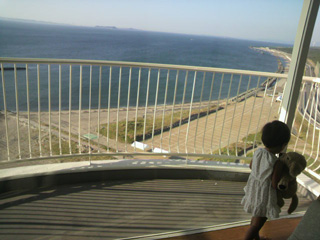 お部屋は絶景ビュー♪この日はトライアスロンの大会があったみたいで、たくさんのケッタマシーン(名古屋弁で自転車)愛好者でごった返してたよ。このあと ハニコが抱っこしてるお気に入りのワンコのぬいぐるみがいなくなっちゃってご機嫌斜めに・・・。