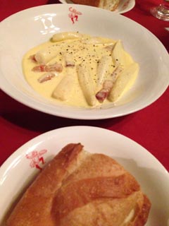 ホワイトアスパラゲげす、カルボナーラソースで。
