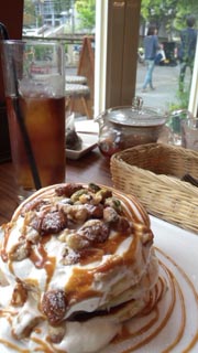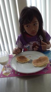 先日、大阪土産にリーガロイヤルのパンケーキを沢山頂いたいてから、ハニコさんの朝ごはんの定番になりました。